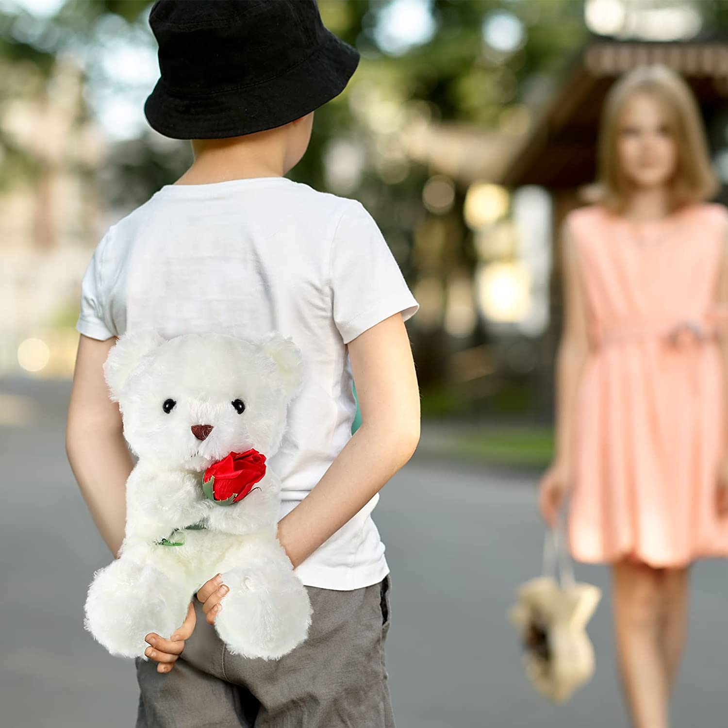 Plush Stuffed Animal Bear with Rose Valentines Day Gifts 11.8 Inches (White)