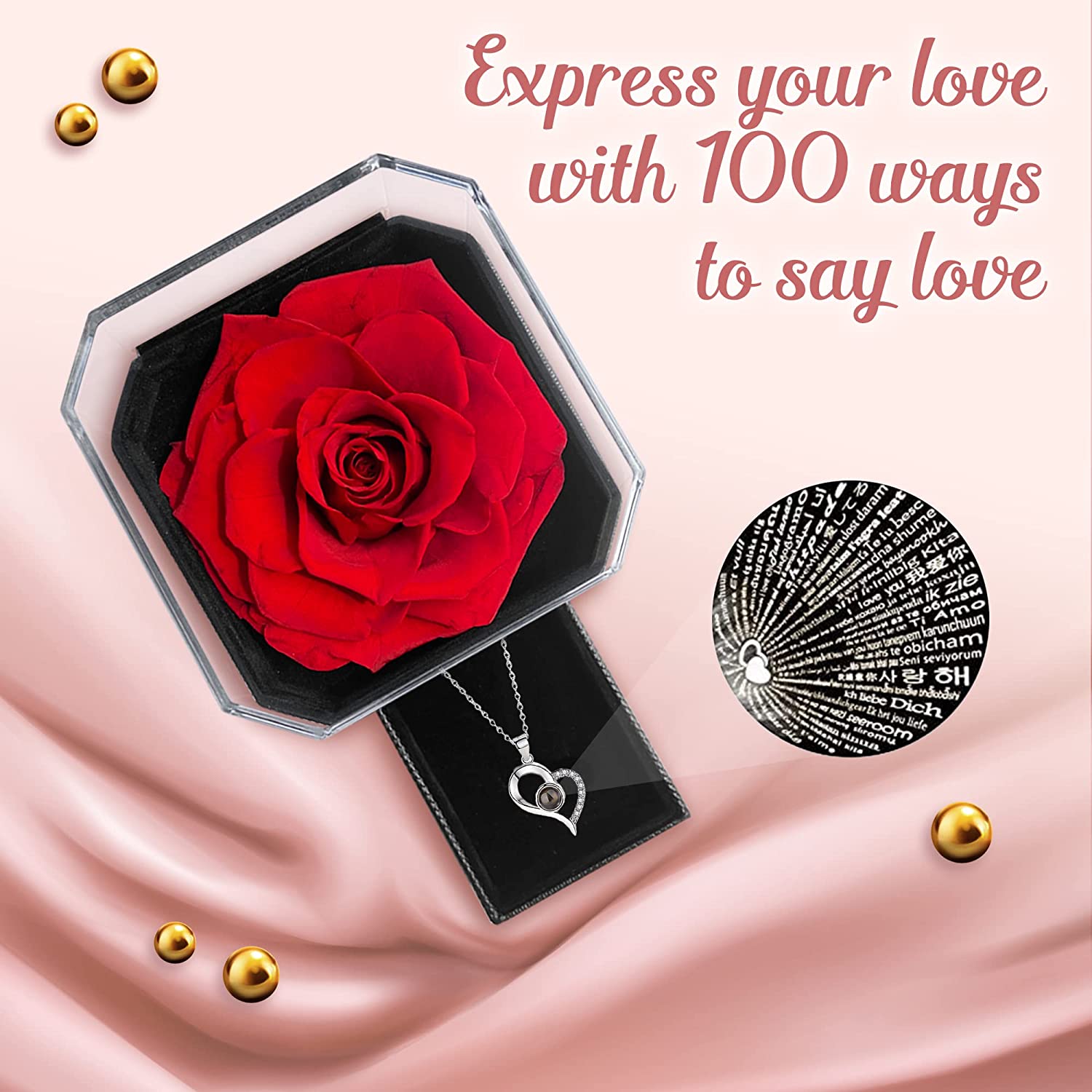 - 💟 Preserved Rose With Necklace 💟 The heart 100 languages I LOVE YOU necklace is hidden inside the box will make the message box perfect. With 100 ways to say, love, forever rose with necklace becomes an exquisite luxury love message for your lovers.