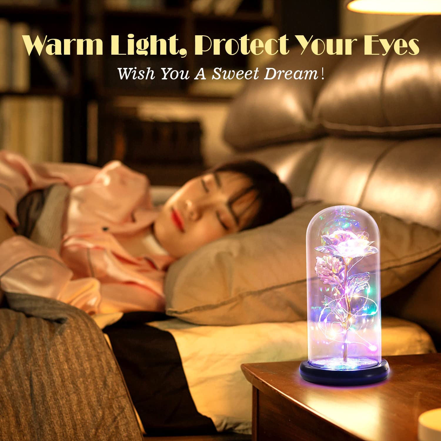 - [Colorful Rose LED Lights] The Rose in glass dome is wrapped around colorful LED strip lights, which light up the inside dome and brighten up the surroundings as well. The galaxy rose powered by 3 AAA power (not included) and the switch is under the wooden base to make it safer, durable and heat-resistant.