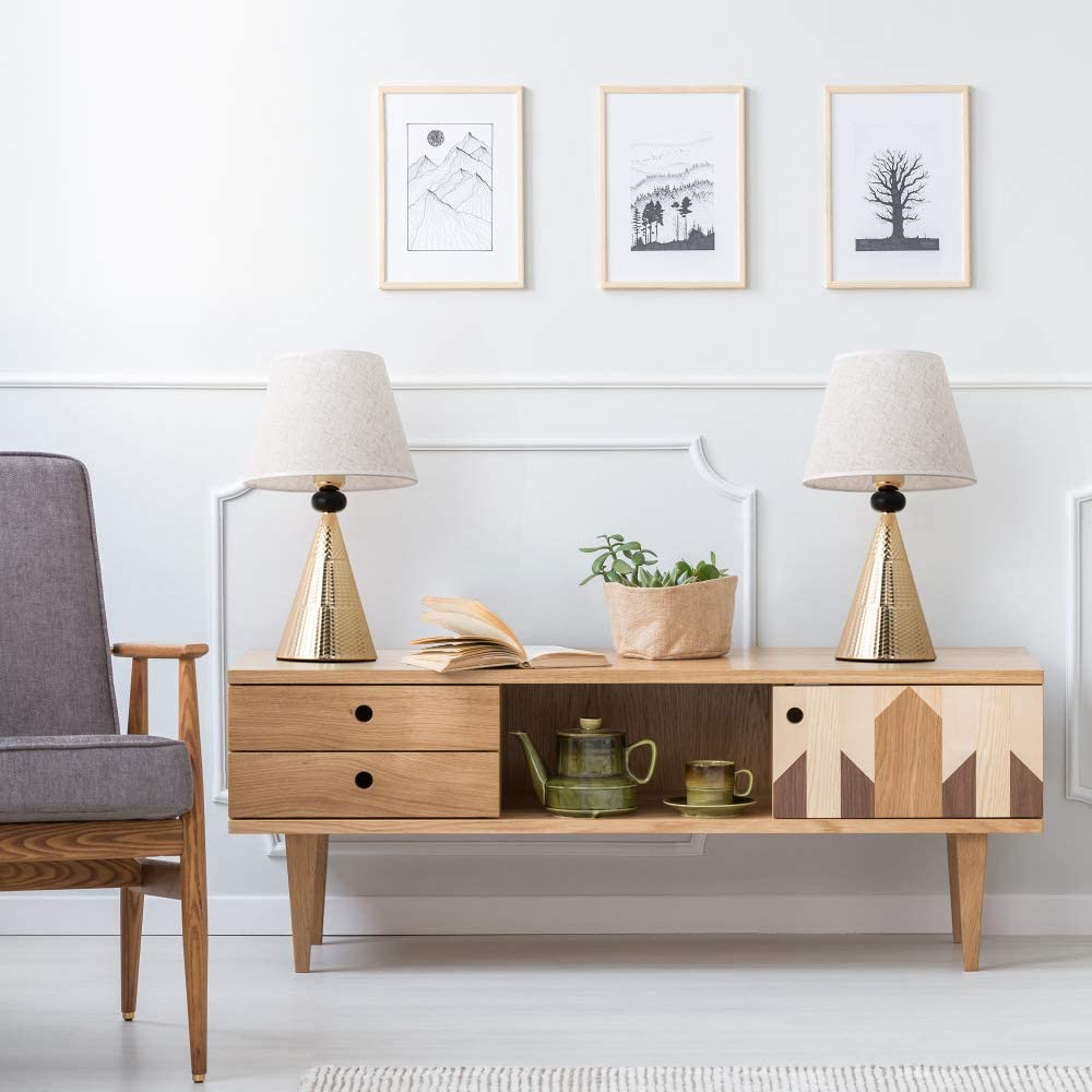 The elegant bedside lamps are great to match different styles of household perfectly. It has the ability to display its retro look everywhere you put it. The linen fabric shade stands out with the metal contrast, making it a simple yet elegant light. Good fabric lampshade softens the light and protect you eyes. The lamps set of 2 with pretty look and multi purpose, will be as nice home decorations or gifts for thanksgiving, New Year, weddings, parties or other special events! Vintage Table Lamps, Set of 2, Modern Lamps with Metal Frame Fabric Shade, Gold *- PERFECT SIZE: Lamp dimension is 16.6 x 6.0 x 5.5 inches, the unique base allows for the lamp to fit on tables of any size. These lamps are design of compact and saving-space, it’s perfect in living room, bedroom, girls room, den, college dorm, bar, hotel, etc. (Please be clear about the size when you browse) *- GENEROUS DESIGN: Based on modern style, these nightstand lamps are designed especially the unique golden frame that gives elegant and charming. With a metal base and linen fabric shade promotes a beautiful and minimalist contrast. It’s a perfect décor in a beautiful modern house for creating peaceful atmosphere and comfortable lighting! *- BULB REQUIREMENTS: The Haitral bedside lamps set of 2 can be only equipped with standard E26 light bulbs, Max 60 watts. They’re compatible with a variety of incandescent, halogen, LED or CFL light bulbs. Its fabric shade softens the light that provides a flicker-free lighting for reading, studying or working. (Bulb isn’t included in the package) *- SAFE & EASY TO USE: The cord, socket and plug of set of 2 nightstand lamps are UL listed. An ON/OFF button on the power cord is easy to turn on off. They are lightweight lamps, easy to move to any place where you have lighting needs and easy to assemble. Very nice minimalist light for the right price! *- Specification: Shade Color: Linen Input Voltage: 110V Power Cord Length: 67 Inches Material: Metal Body, Fabric Shade, Metal Base Lamp Size: 16.6 x 6.0 x 5.5 Inches Bulb Base: E26 (Bulb not included), Max 60 Watts Package Content: 2 x Industrial Table Lamp (Bulb not included)