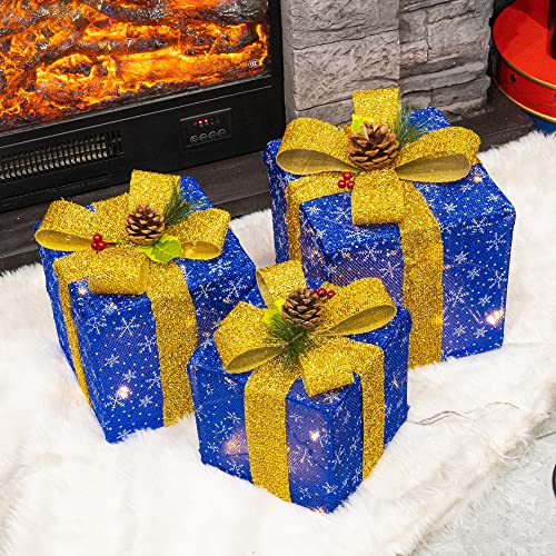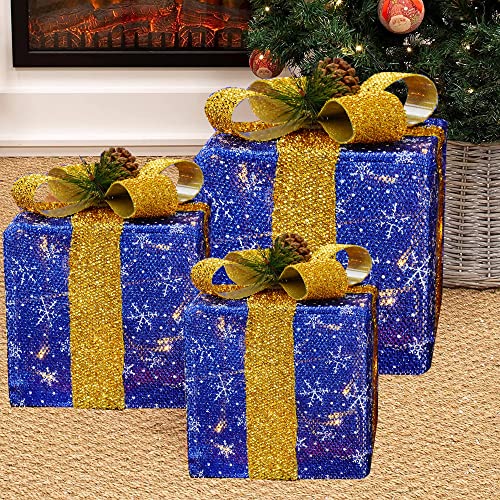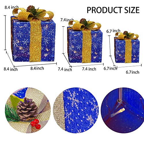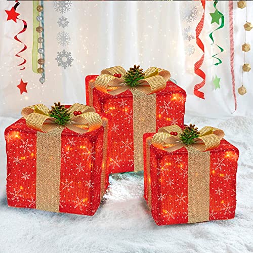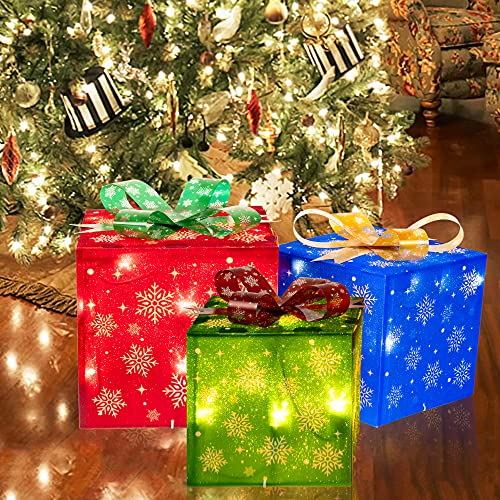 - Christmas lighted gift box: 3 sets of exquisite lighted present boxes (with many classical patterns and bows) are the best choice for Christmas, weddings, banquets, anniversaries, and Christmas decorations for houses, offices, restaurants, hotels, bars, etc. Decorate this beautiful lighted christmas packages in your home, they will be the perfect Christmas decoration for your home or yard.