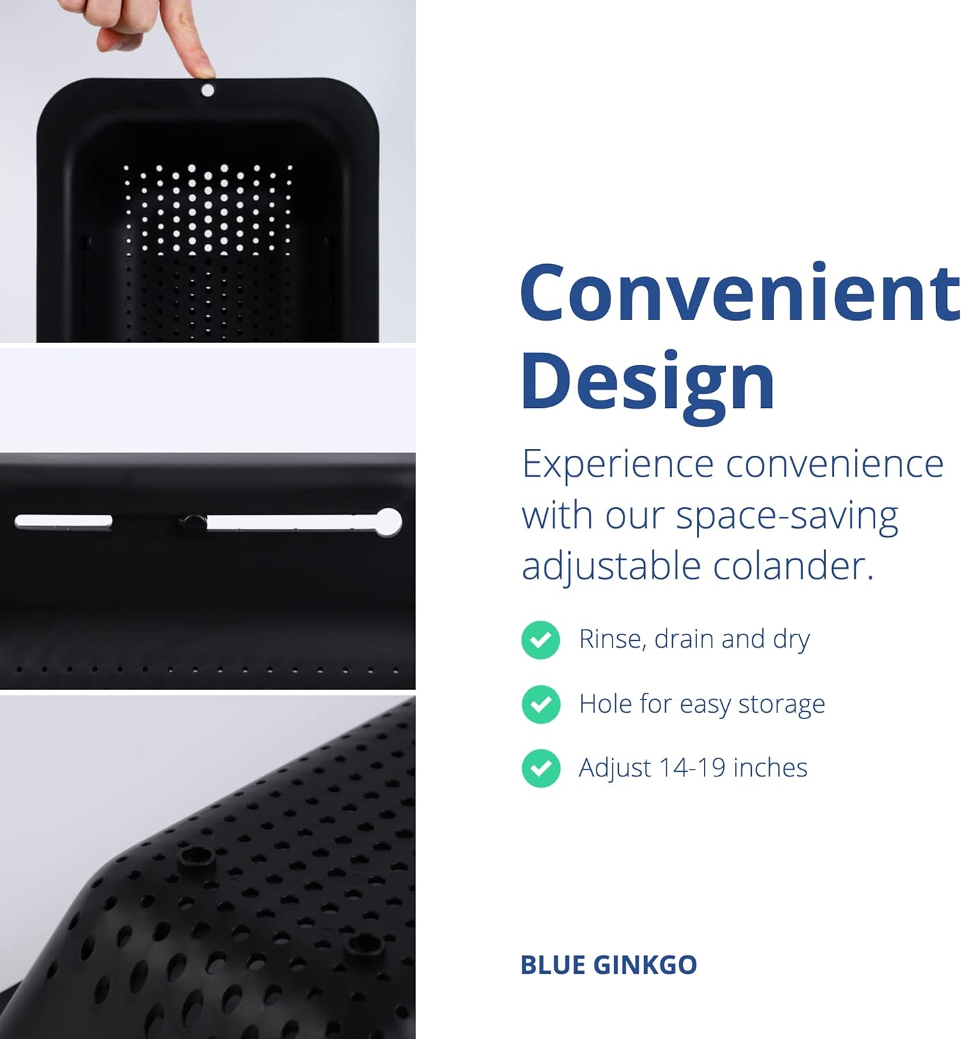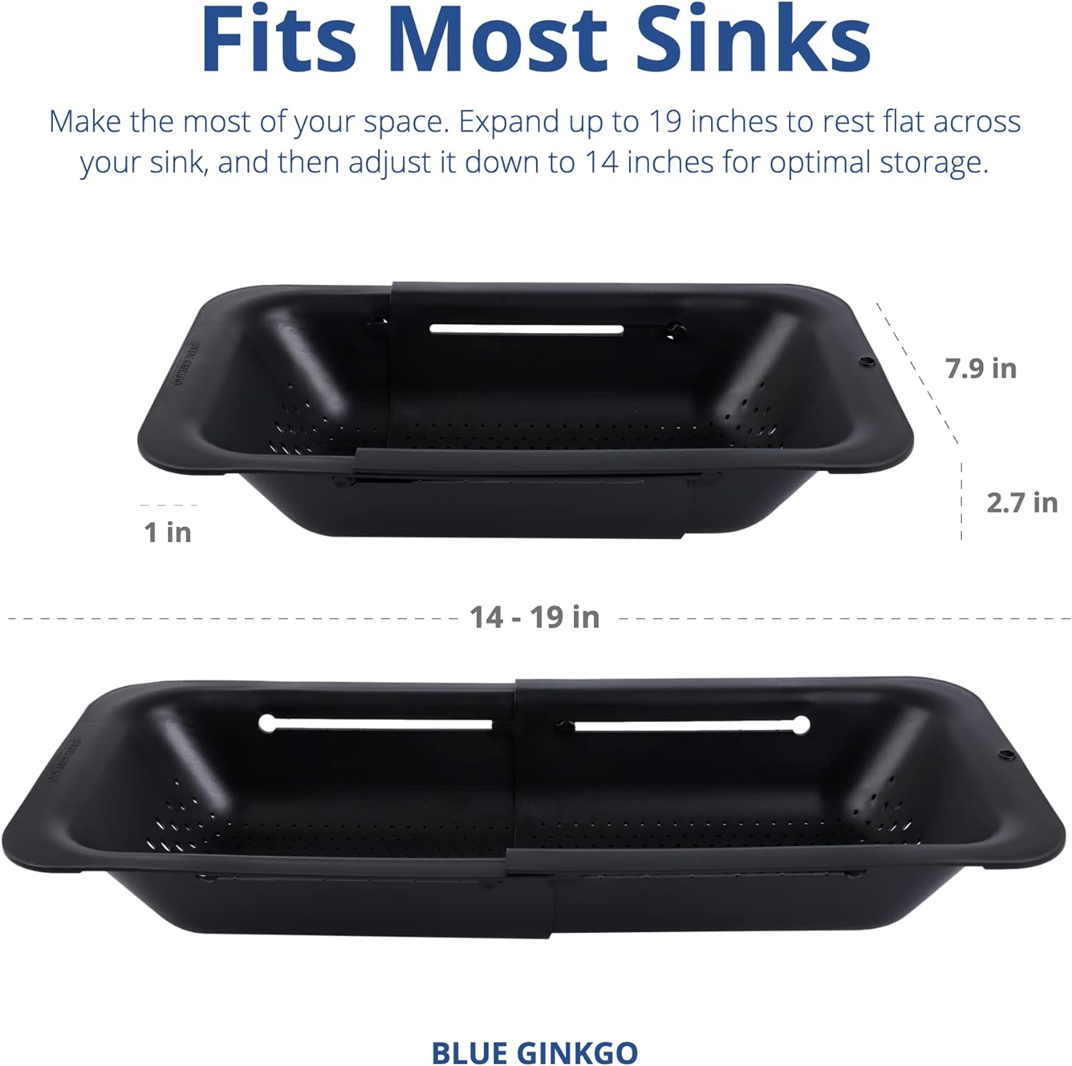 - Modern Design - Adjustable, this colander expands from 14 to 19 inches to hold more or less, save space when not in use and fit most sinks. When stretched over the sink, the bottom is raised from your sink base, preventing drained pasta water from backing up into your food.