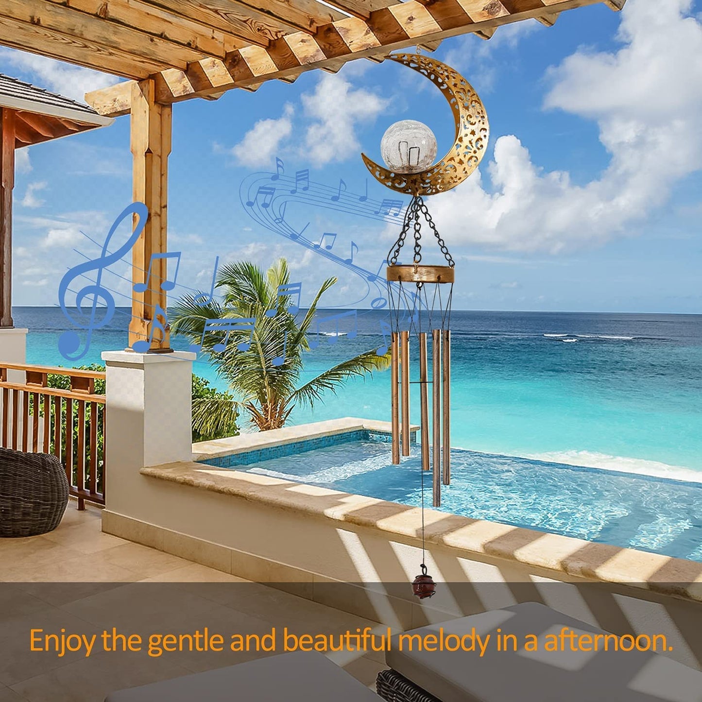 SPECIAL DESIGN:Retro Star music wind chimes, pure hand-made with a strong metal top, 1 big lucky Star,5 bronze durable aluminum tubes . Each metal tube has its own unique tone when it collides.Made of aluminum, it provides beautiful and harmonious sound, and brings clear and pleasant ring to anywhere.When the sun rises, beautiful sunshine is reflected from the the wind chime. Listening to beautiful music in the breeze makes you very relaxed and comfortable. *- 【EXCELLENT QUALITY】Star wind chimes are made of high quality aluminum and durable nylon braided rope. The structure is sturdy and durable, waterproof and windproof. Easy to clean, dustproof and waterproof, not easy to rust or fade,and it can be used for a long time.The resonance time of wind chimes made of aluminum are longer than others, and it is easy to install, bringing a lasting beauty of music. *- 【MEANING OF WIND CHIME】 Wind Chime is a mascot, making it magic and easy to get love, safety, happiness, health and peace. It also symbolizes wealth. The sweet and inviting sound of wind chimes will make you happy and leisure. At the same time, a wind chime symbolizes good wishes, love, safety, health, happiness and joy. For special people,it is a best memorial gift. *- 【BEAUTIFUL HOME DECORATION】 easy to hang. If the garden in your mind is becoming dull and trivial, our wind chimes are able to offer your garden/yard/balcony/window/corridor/entertainment venue a vibrant place. it can be used to decorate girls’ bedrooms, children's bedrooms, living rooms, windows, gardens, terraces and any places needed to add beautiful melody to the environment. At the same time, it can effectively commemorate special people or important memories. *- 【SYMPATHY GIFT】The grace wind chime is not only the best gift for mom, family, friends, girls and your house, garden . child's birthday,mother's birthday, or Mother's Day, Father's Day,Thanksgiving Day,Valentine's Day and Christmas ,birthday gifts for mom,garden gifts for mom, birthday gifts for women,mom's gift,wedding gifts.But also the high-quality interesting wind chimes gardening/home gift for anniversaries. Solar Wind Chimes - Star Design With beautiful star shape design and wonderful voice of nature, A best choice as garden gifts for who you loved on festival, such as Thanksgiving, Christmas, birthday, etc. Frist-time Use: Press the switch ""ON"" on the solar battery boxs before Charging under the sunlight. Fully charge by direct sunlight for 6-8 hours. Solar panel must receive direct sunlight. No ambient light on solar panel at night. (The battery is included in the product) Crackle Ball Design The crackle ball design is different with the traditional lighting ball design, bring more texture warm white light and create a comfortable atmosphere for your garden. Solar Powered Solar powered supply design is energy-saving and environment. Automatically absorb sunlight throughout the day and convert it into electricity in the battery. Solar Wind Chimes will turn on and light for 6-8 hours when it is dark, will turn off in daylight or when battery has lost charge. First Time-Use Push button to the ""ON"" mode. No need to turn off while in use. Solar Wind Chimes should be left in direct sunlight for at least 8 hours after installation to allow the batteries to reach full charge. Product description Color: Bronze Overall Size: 38 inches Material: Metal+ glass Waterproof Class: IP65 Charging Time: 6-8 hours under sunlight Working Time: 8-10 hours after full charge Package Include: 1 x wind chime, 1 x user manual