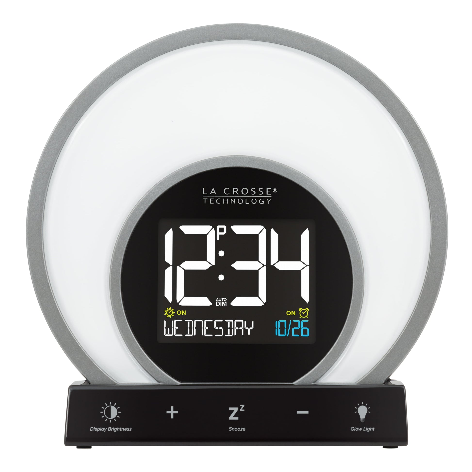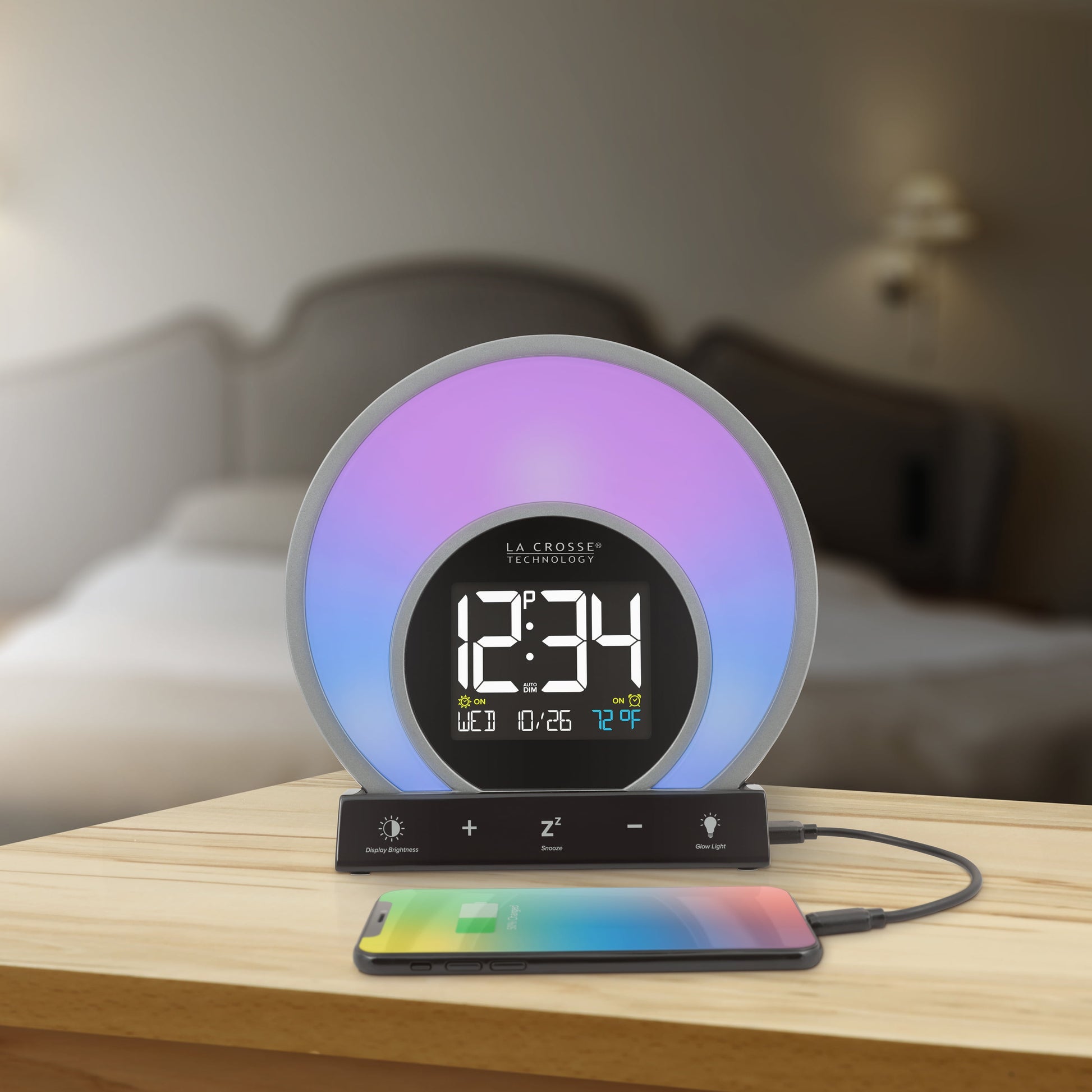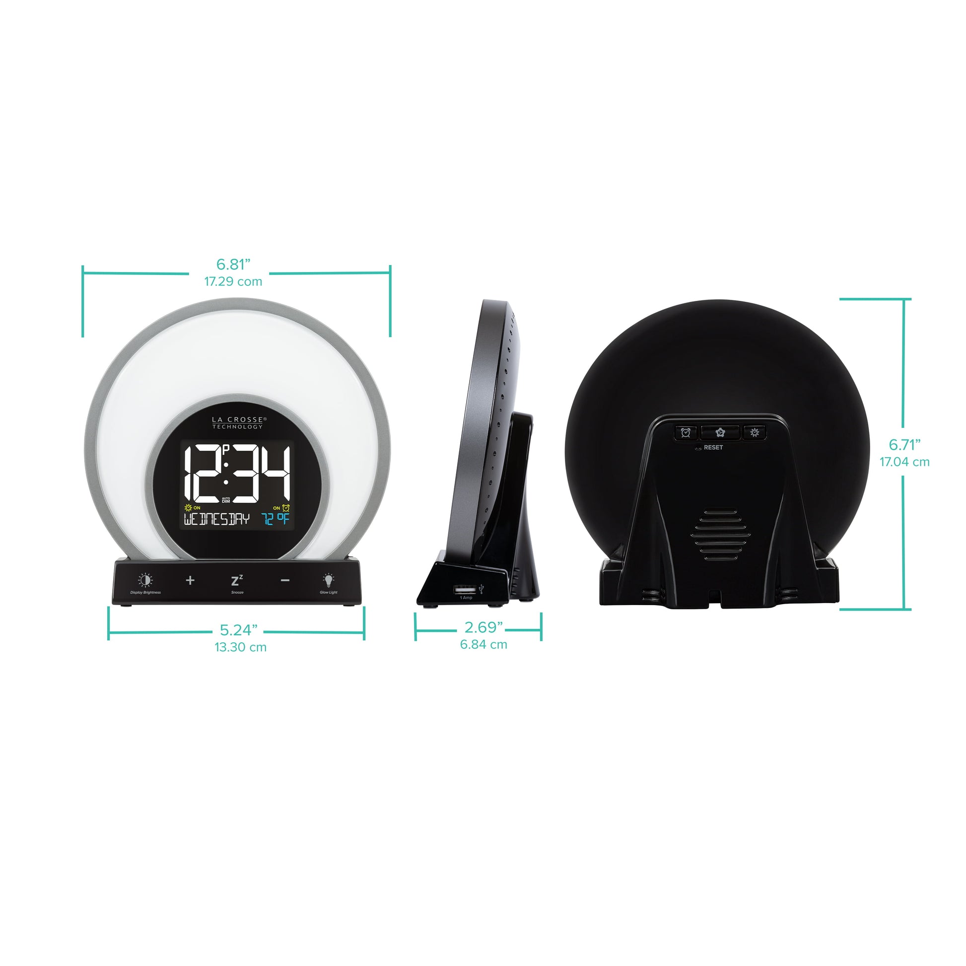 S Light Alarm Clock from La Crosse Technology features 3 light modes and 14 unique color options, ensuring there's a glow for every day and mood. Illuminate your bedroom with your favorite vibrant color, or cycle through all of the color options at the touch of a button. Set Light Intensity controls to your preference and adjust to a sunrise natural light alarm to wake you in the morning. Will simulate a fading sunset with its evening set mode for a slow gradual rest and program the snooze time duration for a sound alarm for some extra rest. USB port charges your phone or mobile devices and LCD displays your current room temperature. Begin and end your day with La Crosse Technology’s W74146 S Light LCD alarm clock! La Crosse Technology Soluna-S Light Sunrise Black LCD Alarm Clock with Temp. and USB Port, W74146-Int *- 3 Light modes: Color cycling (14 color rotation), Evening mode (sunset fade), and Single color select (14 choices, such as Red, Fire, Yellow, Green, Forest, Ocean, Purple and more) *- Natural Light alarm (simulates Sunrise) and Evening Light mode (30 min cycle simulates sunset) *- 2 minute Crescendo Sound Alarm with programmable snooze (5 to 120 minute duration) *- Auto-Dim Backlight with Intensity control *- 1 Amp USB Charging Port (charging cord sold separately) *- Indoor temperature (range: 32°F to 99°F; 0°C to 37°C) *- Includes 5V AC adapter; optional CR2032 button cell (not included) battery for power loss