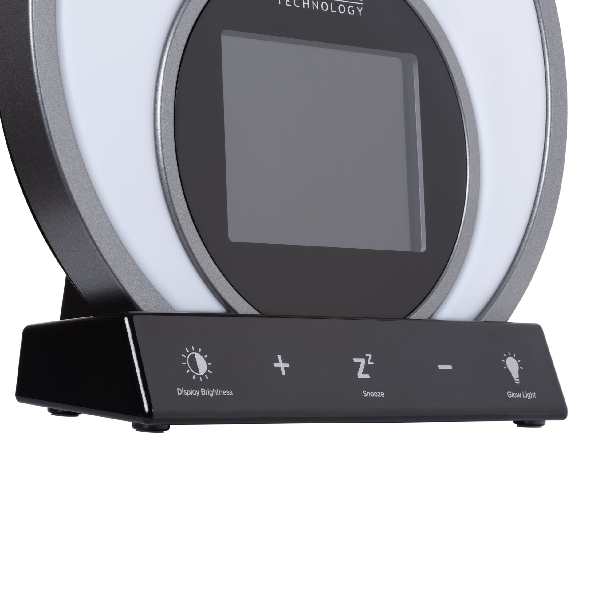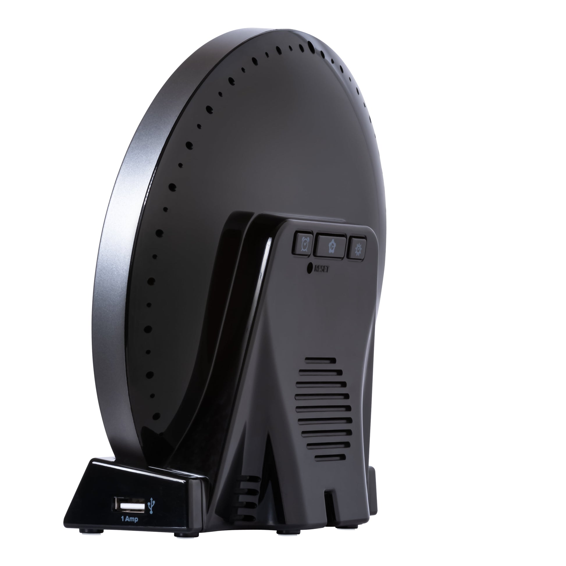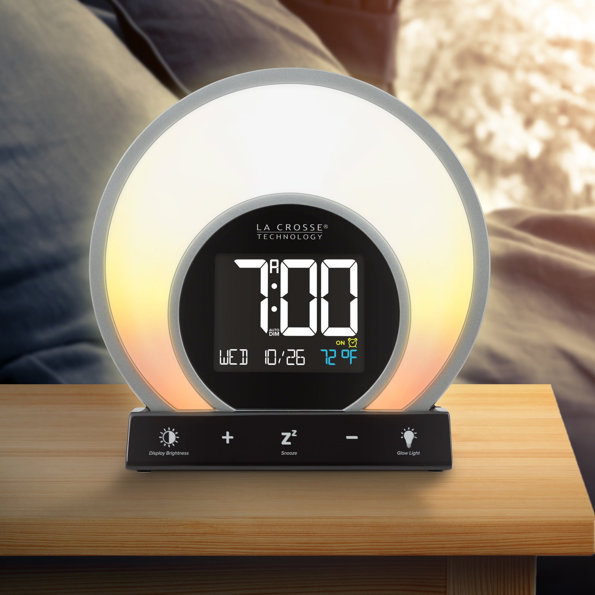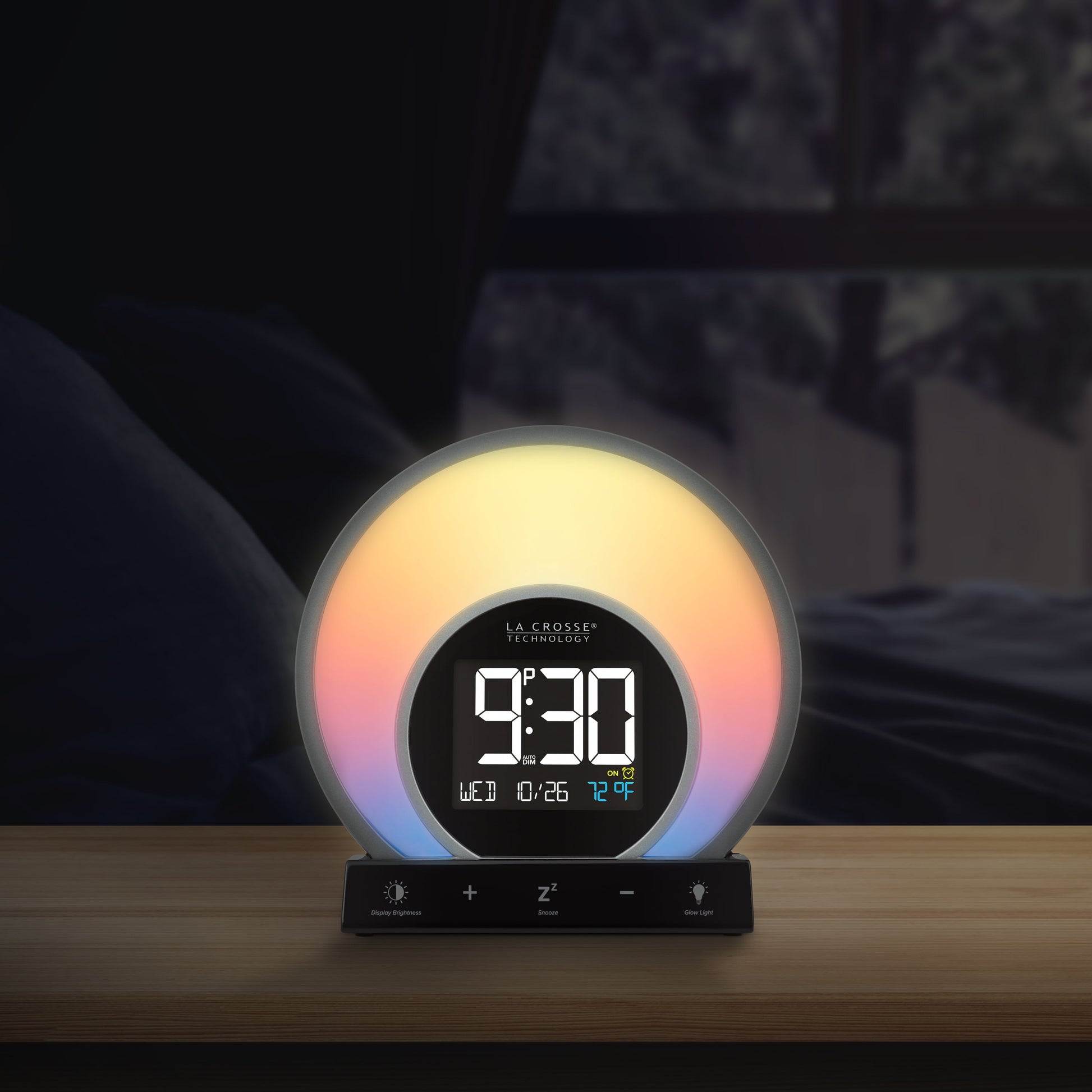 S Light Alarm Clock from La Crosse Technology features 3 light modes and 14 unique color options, ensuring there's a glow for every day and mood. Illuminate your bedroom with your favorite vibrant color, or cycle through all of the color options at the touch of a button. Set Light Intensity controls to your preference and adjust to a sunrise natural light alarm to wake you in the morning. Will simulate a fading sunset with its evening set mode for a slow gradual rest and program the snooze time duration for a sound alarm for some extra rest. USB port charges your phone or mobile devices and LCD displays your current room temperature. Begin and end your day with La Crosse Technology’s W74146 S Light LCD alarm clock! La Crosse Technology Soluna-S Light Sunrise Black LCD Alarm Clock with Temp. and USB Port, W74146-Int *- 3 Light modes: Color cycling (14 color rotation), Evening mode (sunset fade), and Single color select (14 choices, such as Red, Fire, Yellow, Green, Forest, Ocean, Purple and more) *- Natural Light alarm (simulates Sunrise) and Evening Light mode (30 min cycle simulates sunset) *- 2 minute Crescendo Sound Alarm with programmable snooze (5 to 120 minute duration) *- Auto-Dim Backlight with Intensity control *- 1 Amp USB Charging Port (charging cord sold separately) *- Indoor temperature (range: 32°F to 99°F; 0°C to 37°C) *- Includes 5V AC adapter; optional CR2032 button cell (not included) battery for power loss