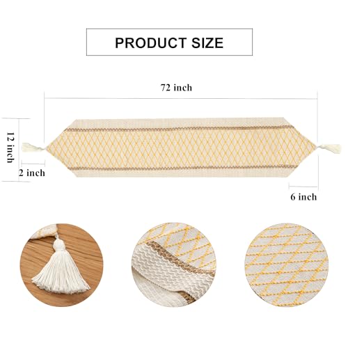 - [Size and Material] The table runner is made of cotton and linen crochet fabric with mesh patterns. It has a medium thickness that is sturdy and attractive. The dimensions of the table runner are 12 inches x 72 inches, this doesn't include the tassels.