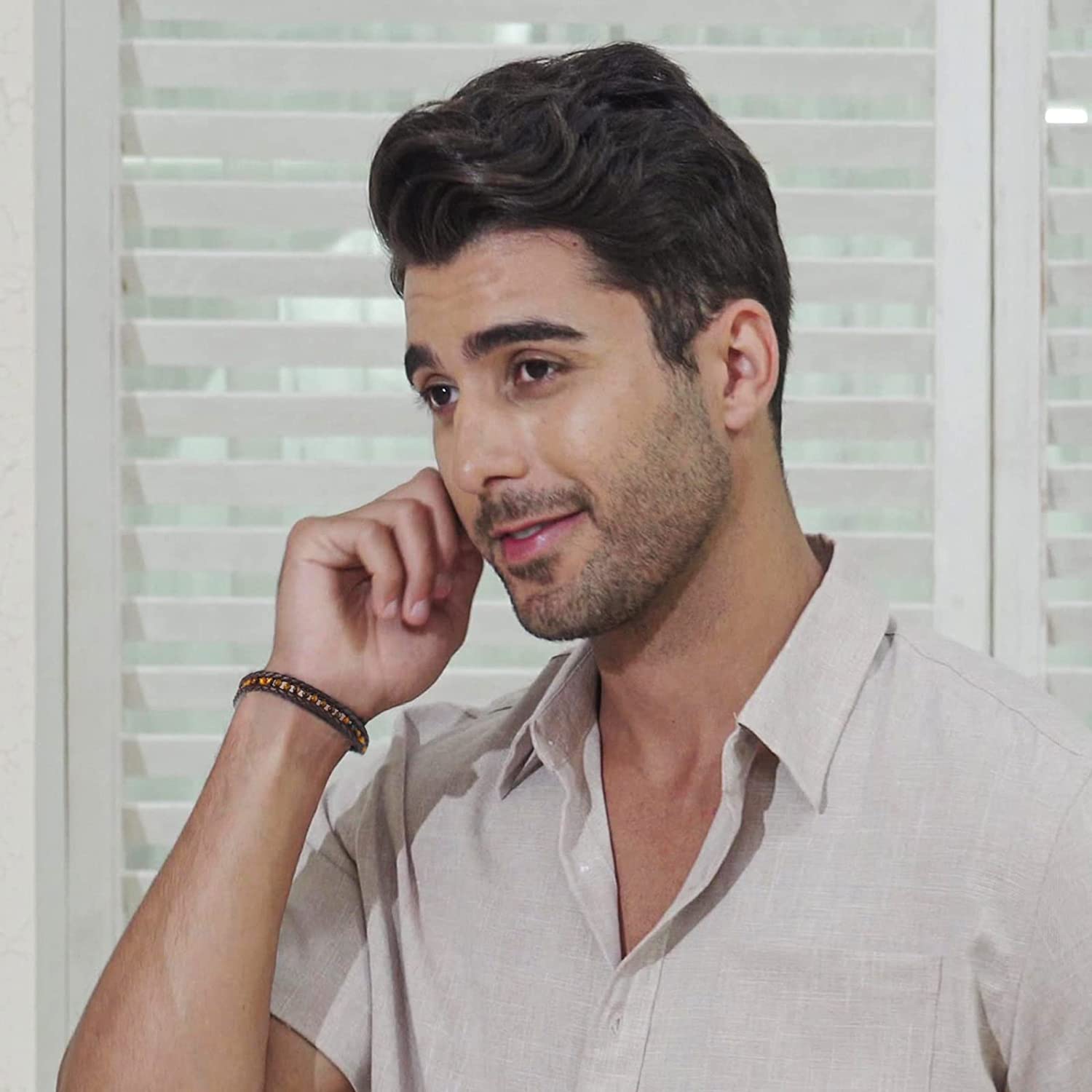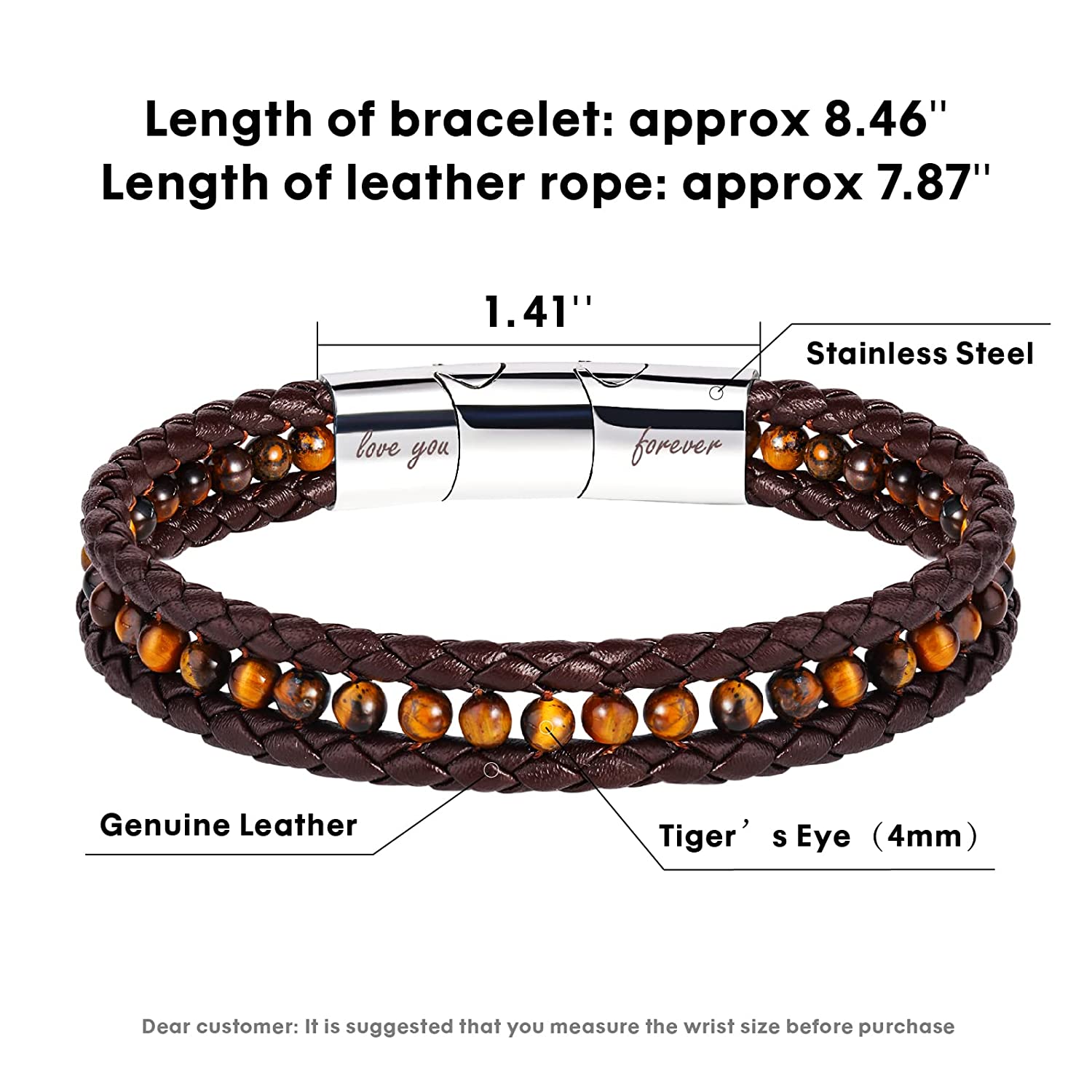 - 【Size Adjustable & Chic Look】 The bracelet has a total length of 8.5"(21.5cm). Fit for the wrist length of 7.5"-8". Bead Diameter: 4mm. Joined by a stainless magnetic clasp, a double row of leather cable and a single row of Tiger's Eye give your wrist a chic, masculine look.