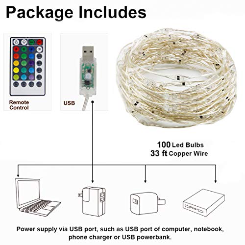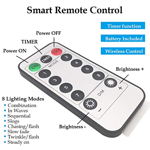 - USB-powered and remote control: Directly plug in/unplug it for power on/off and you can press the button on the USB to adjust 8 modes setting. And you can easily turn on/off the lights through the remote, set them in timer to auto on and off each day, adjust the brightness, adjust 8 modes setting.