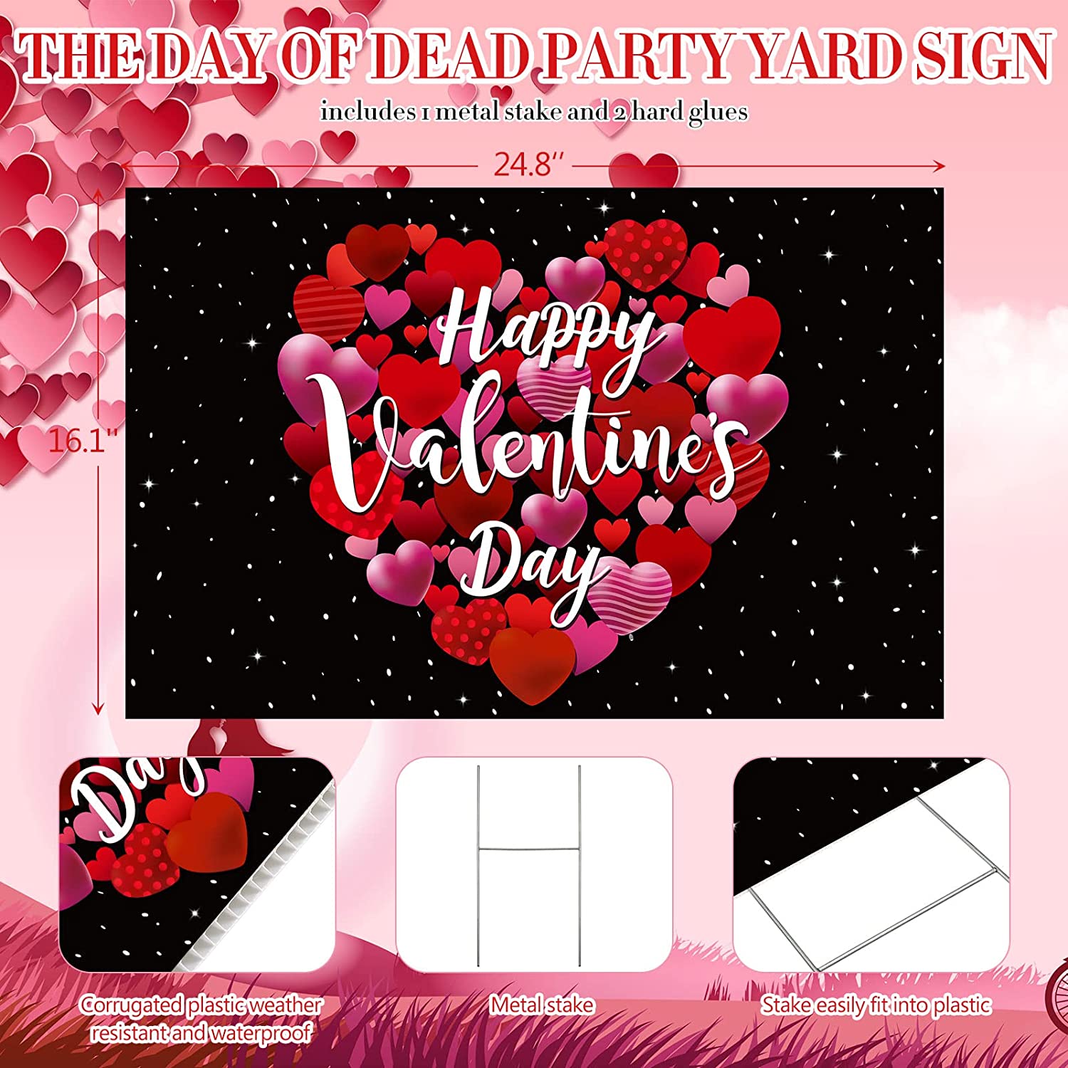 - Package Include: you will get 1 set of Valentine's Day party yard sign with a H shaped metal bracket and 4 pieces of fixed hard glues, the happy Valentine's Day yard signs measure about 24.8 x 16.14 inches, the suitable size will not appear too small or too big, these Valentine's Day yard signs will attract people's attention and become a beautiful landscape