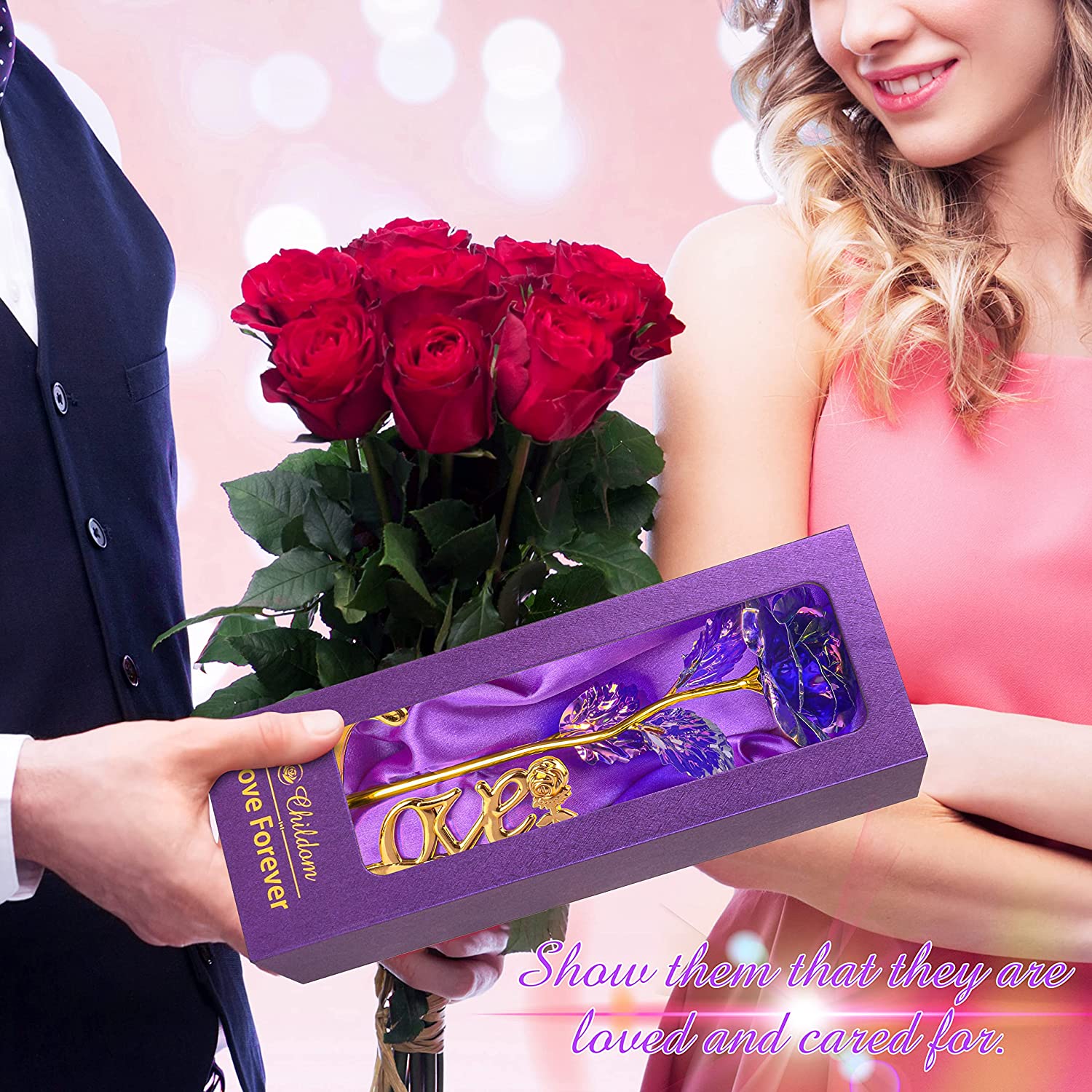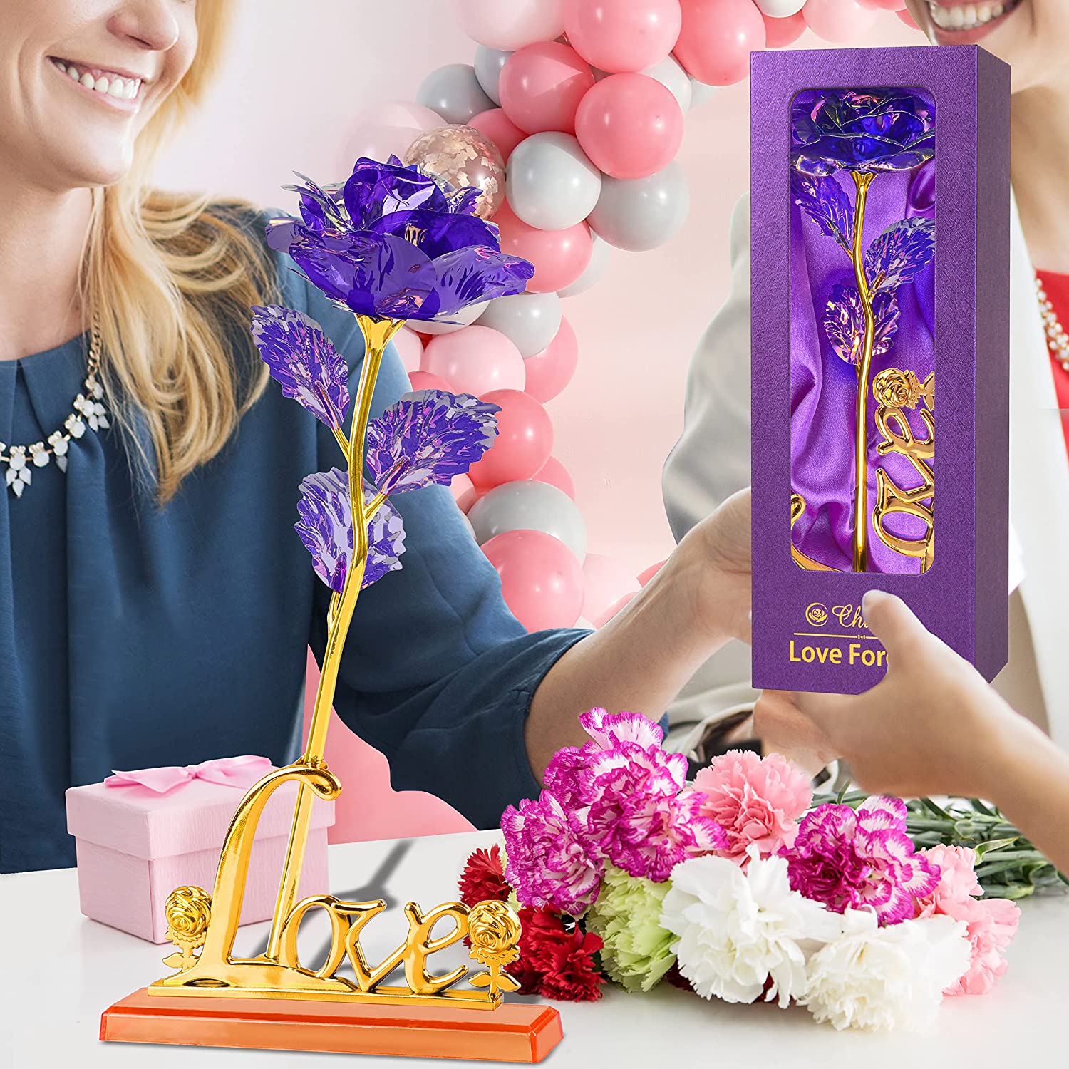 - Purple Valentines Day Rose Gifts For Womens: Best Valentines Day rose flower Women Birthday Gifts, Romantic gifts for women who have everything. Purple Rose Flower with Gold base "LOVE" letters,This flower is a symbol for love and romance, and a special way to say "I love you". It is a perfect gift for your girlfriend, wife, mom, Aniversary, etc. There’s no better way than a rose flower gift to express your feelings and love during Valentines Day.