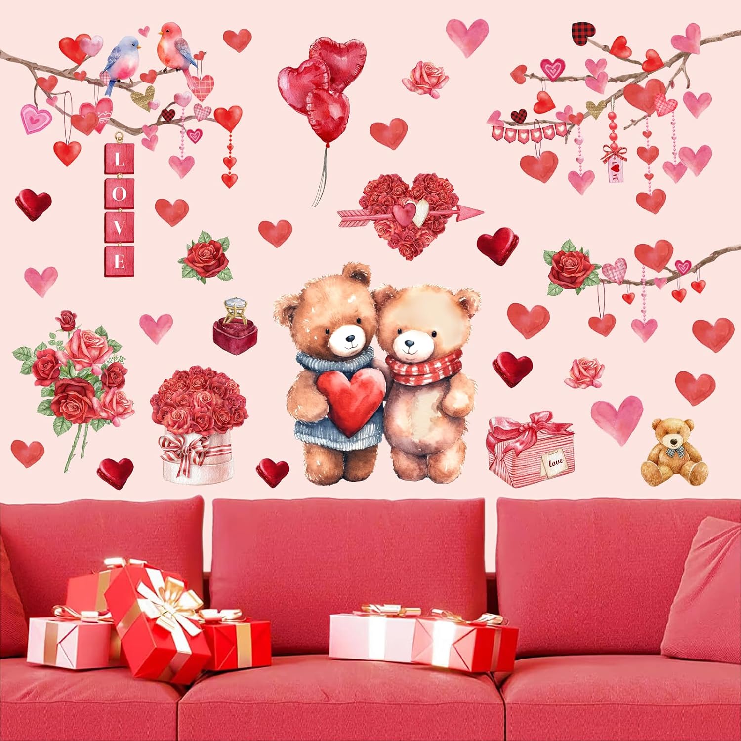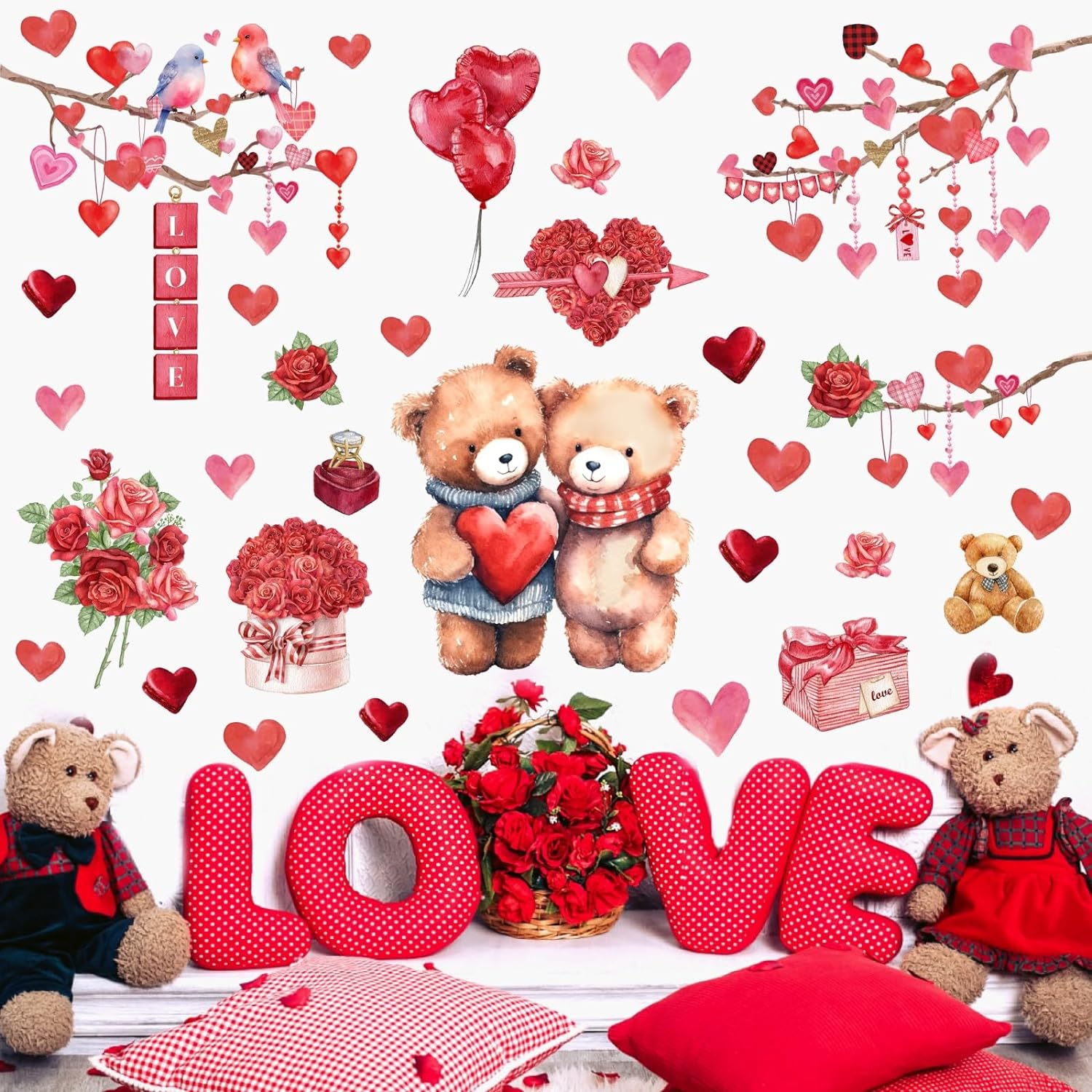 Valentine's Day Wall Decals Love Heart Wall Stickers Couple Bear Rose Decals Peel and Stick Love Tree Branch Stickers Happy Valentines Window Decals for Bedroom Anniversary Party Supplies Spring Decor