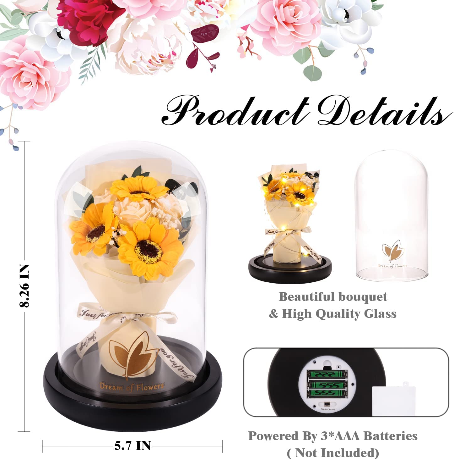 Valentines Flowers Gifts Artificial Flowers Bouquets, Sunflower Rose Flower Gift in Glass Dome