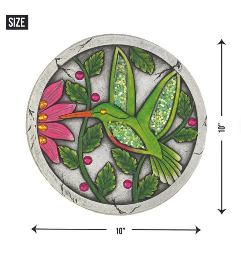 Make your garden sparkle with this whimsical hummingbird garden stone. This decorative stone features vibrant green and pink colors with glitter accents that will sparkle in the sunlight. This garden accent will bring charm and appeal to any space perfect for marking pathways and flower beds as well as decorating vegetable patches and ponds. Spruce up your garden with this charming garden stepping stone! Use for anything including a winding pathway, commemorative monument, garden decors, vegetable patch accent, or even a shelf ornament.