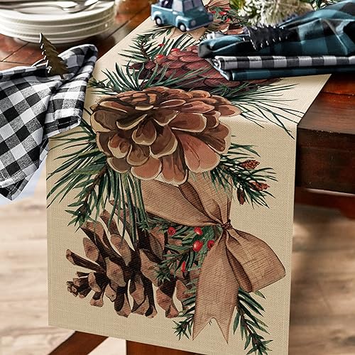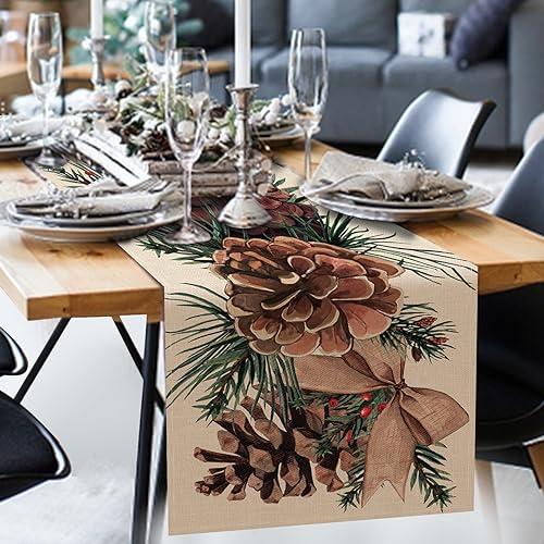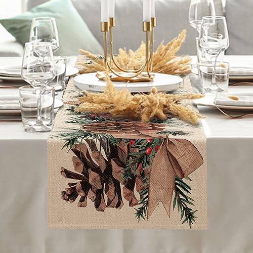 Winter Pine Cone Table Runner, Pine Needle Branch Red Berry Bow Farmhouse Kitchen Dining Table Decor,
