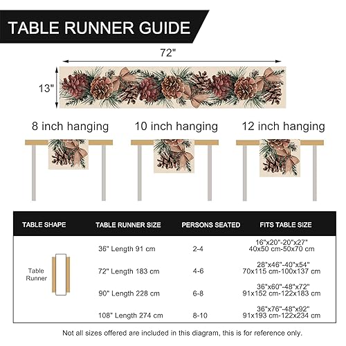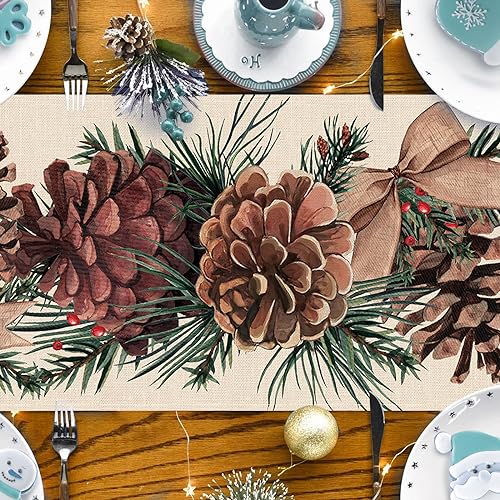 - Uniquely Designed Table Runner: Our rustic farmhouse linen tabletop runner adopts the most popular element design nowadays. Use the winter themed table decorations we provide to decorate your coffee table, dining table, buffet table and kitchen to express your positive attitude towards life. Printed with pine cones, pine needles, red berries, bow patterns, our table runner will be the perfect decor for winter, Christmas