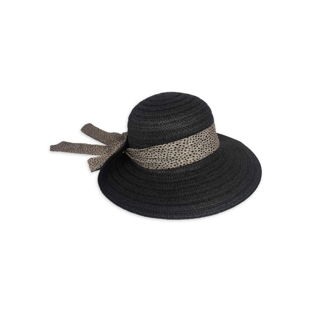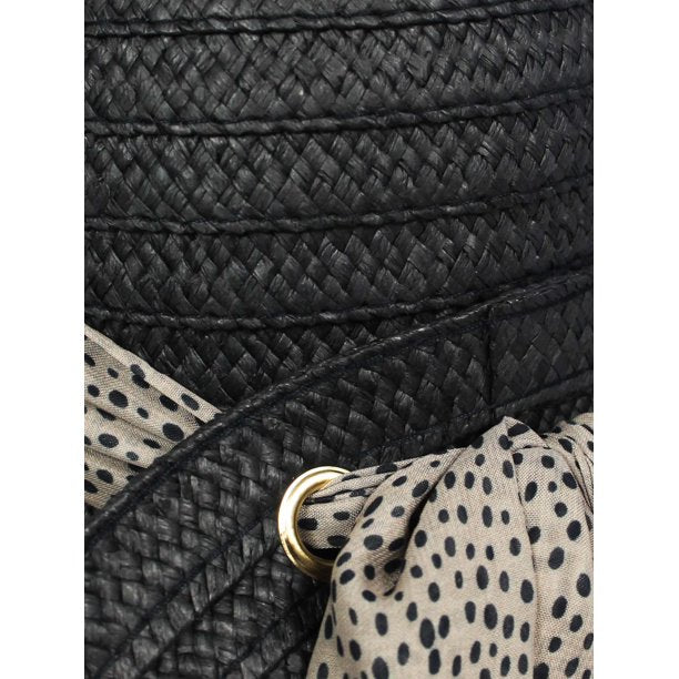 Women's Asymmetrical Straw Sun Hat with Printed Ribbon Scarf- Black