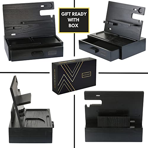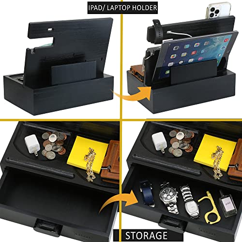 - Drawer Included: Our wood phone docking station has a pull out drawer which can help you store extra desktop accessories; Great gift for your husband, dear dad, for your men who you value; This is also fit for women to place on dressing table to store some makeup items or perfume, jewelry.