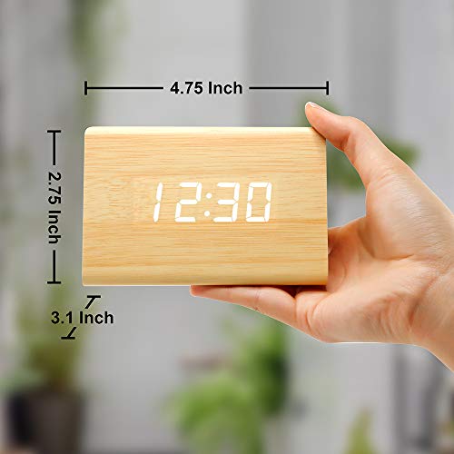 - ELEGANT & MODERN DESIGN: Modern simplicity design with no buttons or plastic parts located on the front and four sides of the clock. LED light glows through the wooden finish for a clean modern look. Matches perfectly with any modern designed office or home furniture like bedrooms, kitchen, bed side table, living rooms, etc. Clock measures approx. 4.5 x 3 x 3 inches. Light weight and portable, can be used at home, office, or even take it during travel.