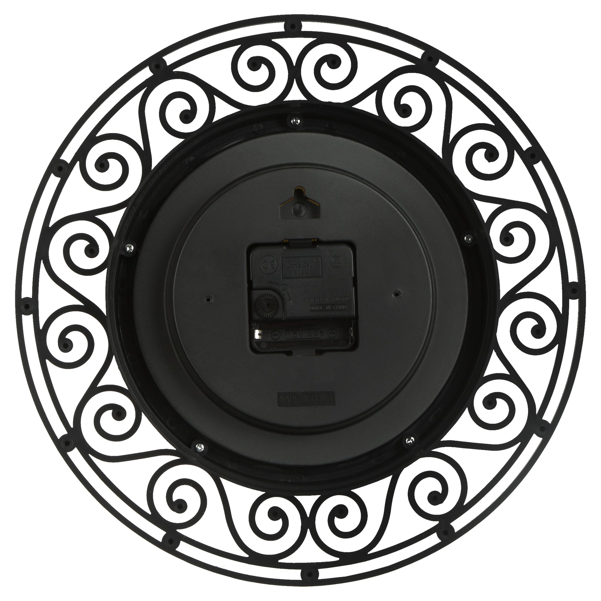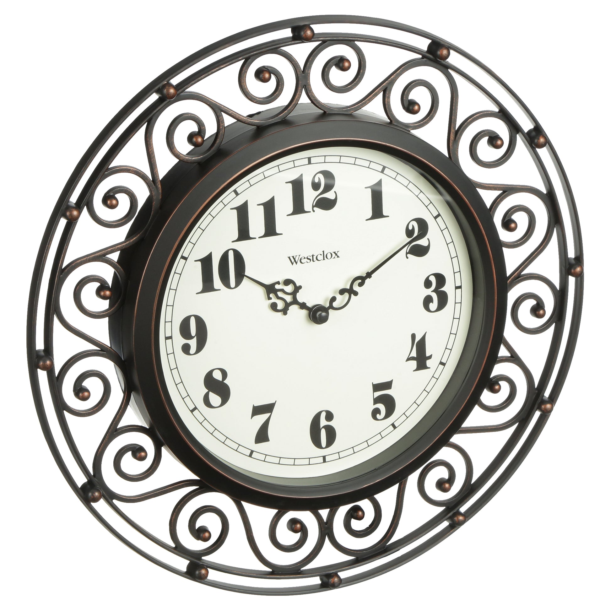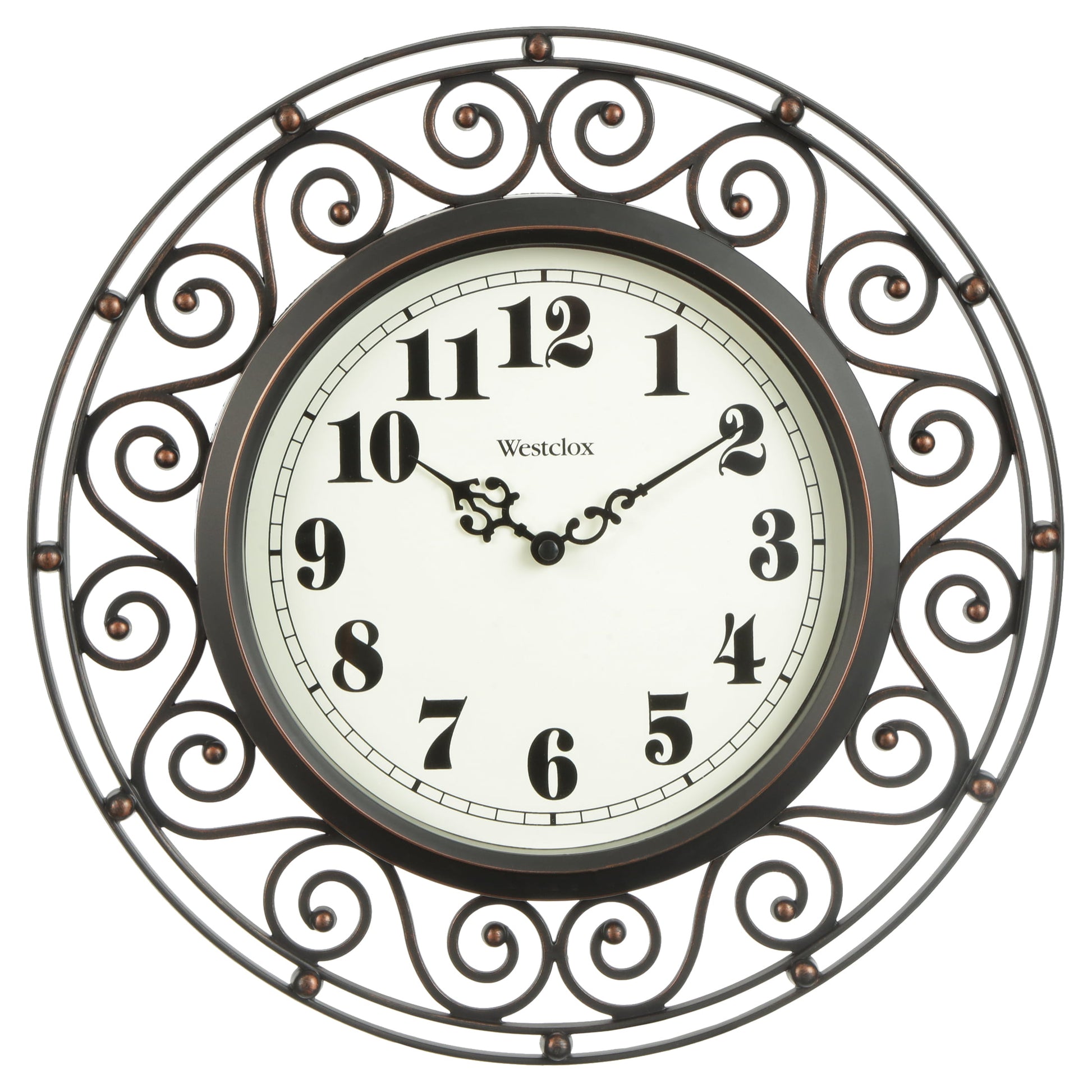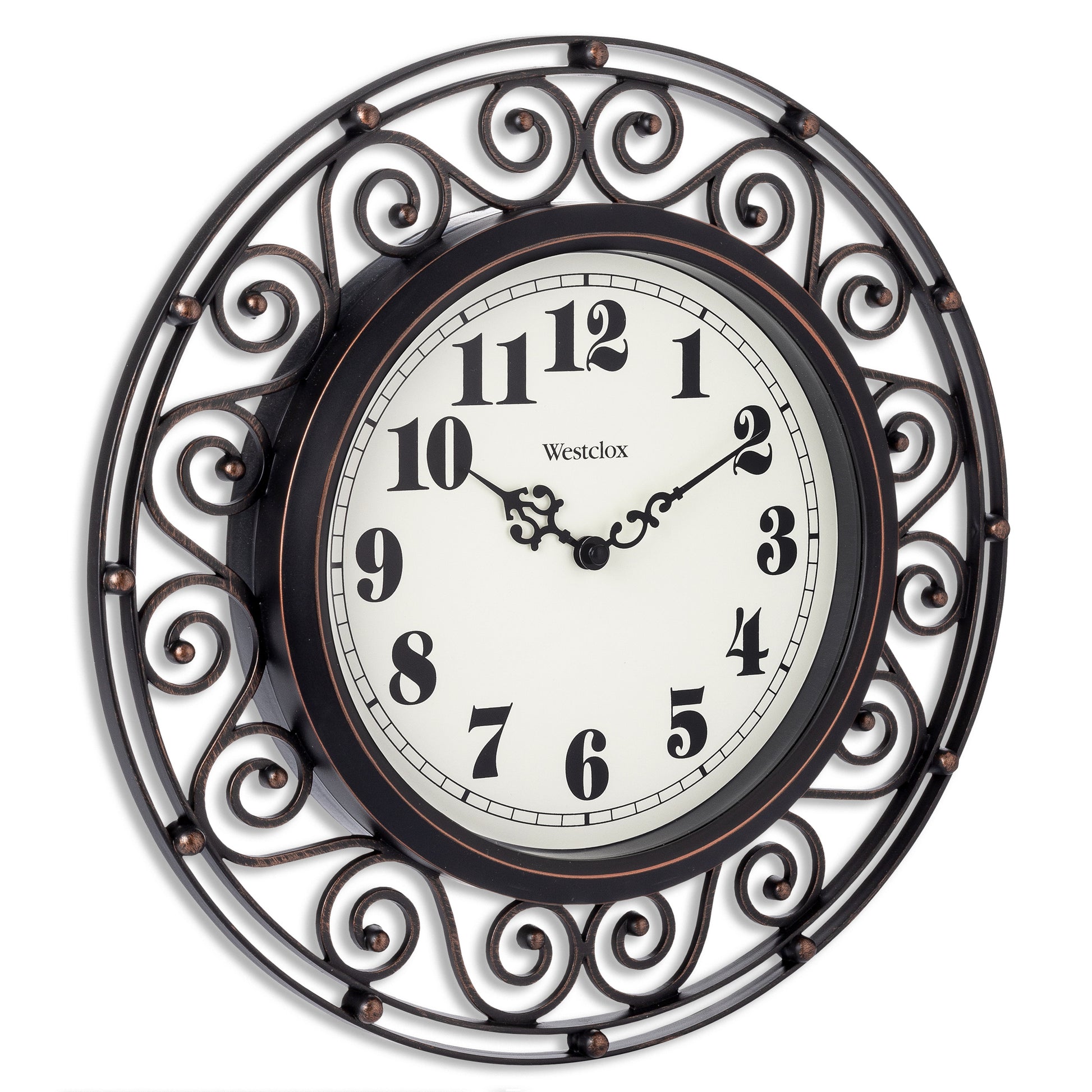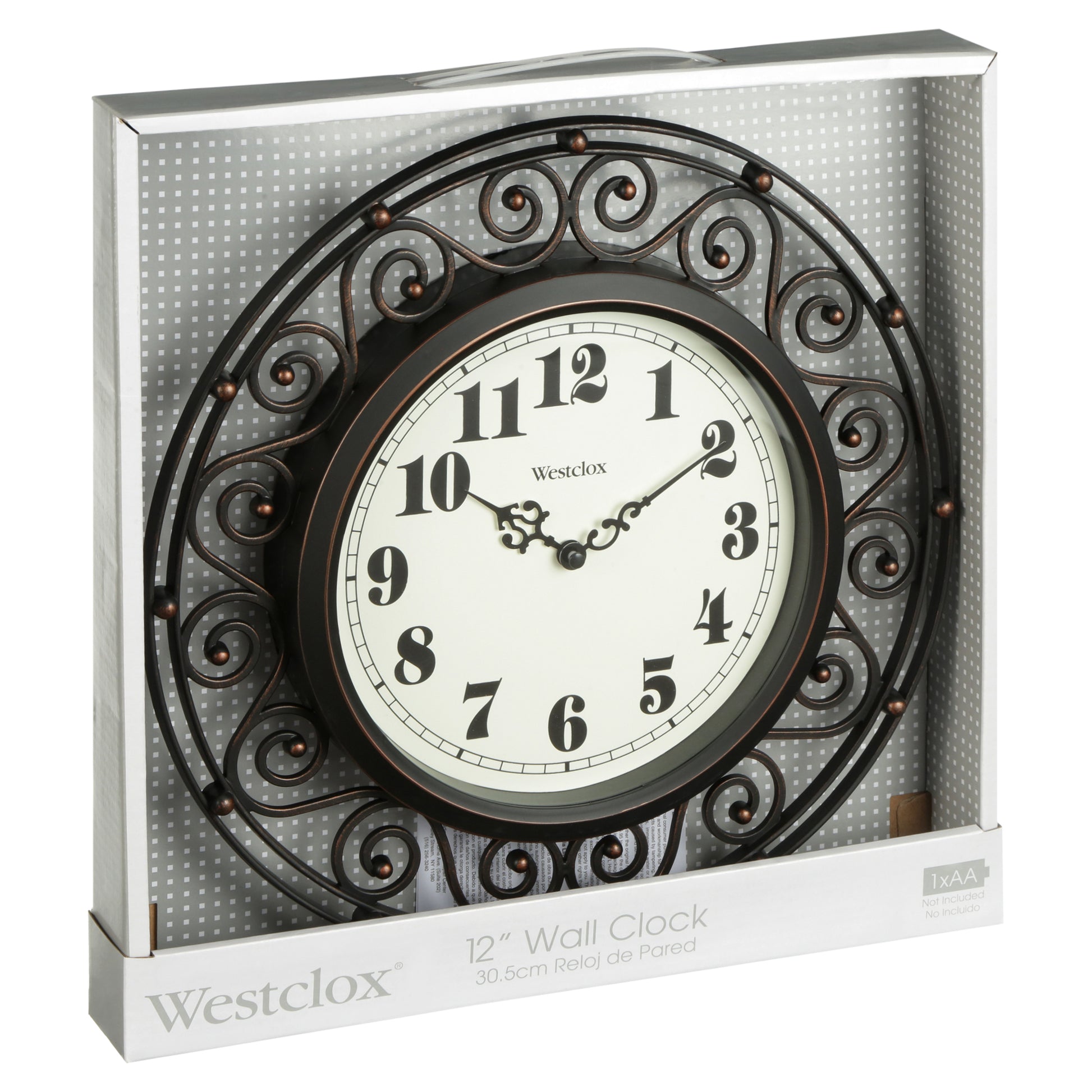 Always keep track of time with this attractive Westclox Wall Clock. It features a stylish wrought iron look to enhance your decor. This round wall clock has a hand-rubbed case finish with a convex glass lens. The lovely detail around the edge helps to complete the design. This decorative wall clock has large black numbers with hour and minute hands and is ideal for any room in your home. It pairs well with a variety of interior decor schemes. Give it as a thoughtful gift for someone special for a birthday, holiday or house warming. Westclox Wrought Iron Look Decor Wall Clock: *- Decorative wall clock is 12" round *- Hand-rubbed case finish *- Round wall clock has a convex glass lens *- Wrought iron wall clock features large black numbers *- Has a stylish look to complement your decor *- Goes nicely with other decorations and furniture *- Nice gift idea for a loved one on any occasion