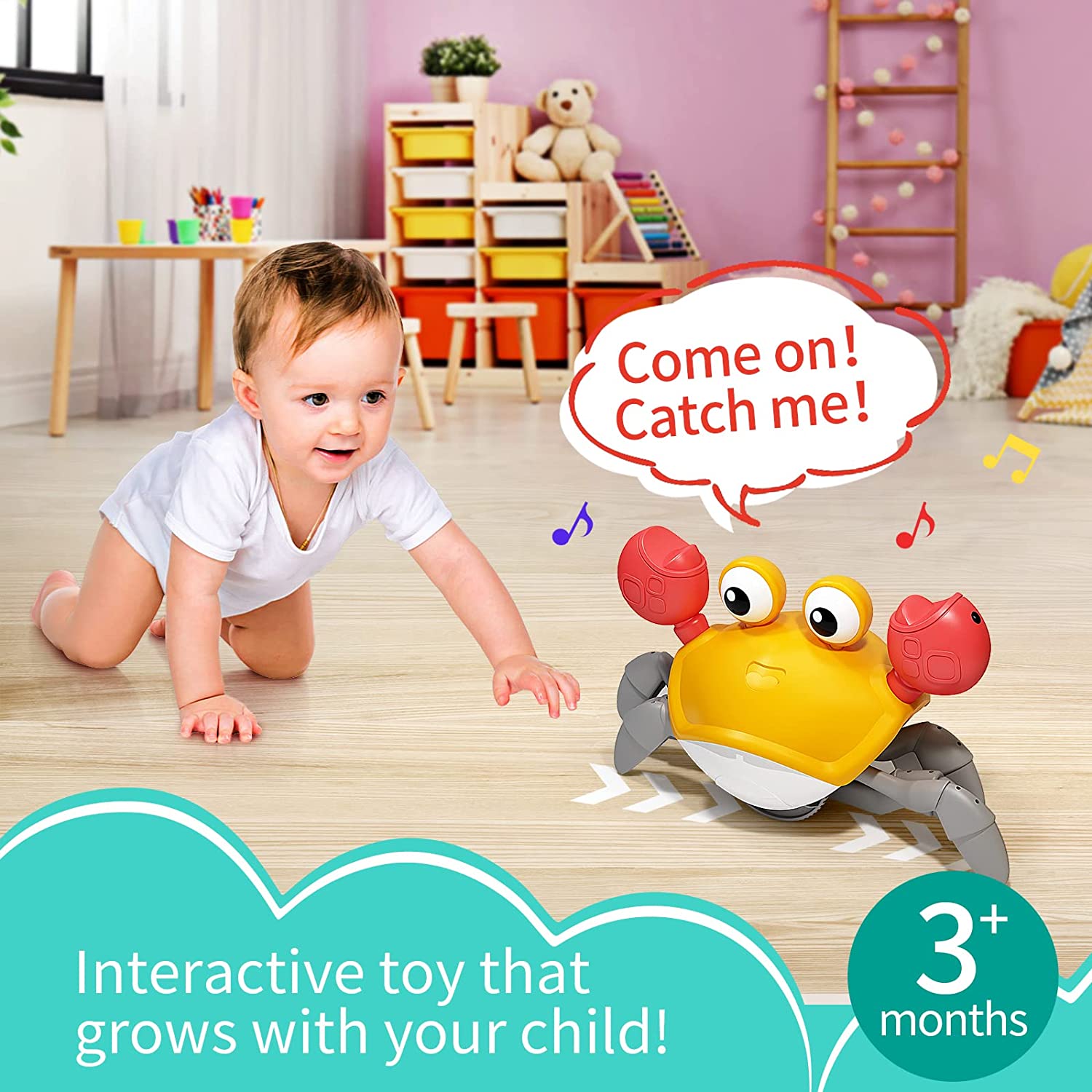 - 【Fun and Smart Crab Toy】Adopted advanced infrared technology,this crawling crab is super fun for babies to play with - it will crawl away to opposite direction when it encounters an obstacle. It is a super fun interactive toddler toy to encourage babies to crawl. Note: Do not use this toy on carpet, in water or humid environments.